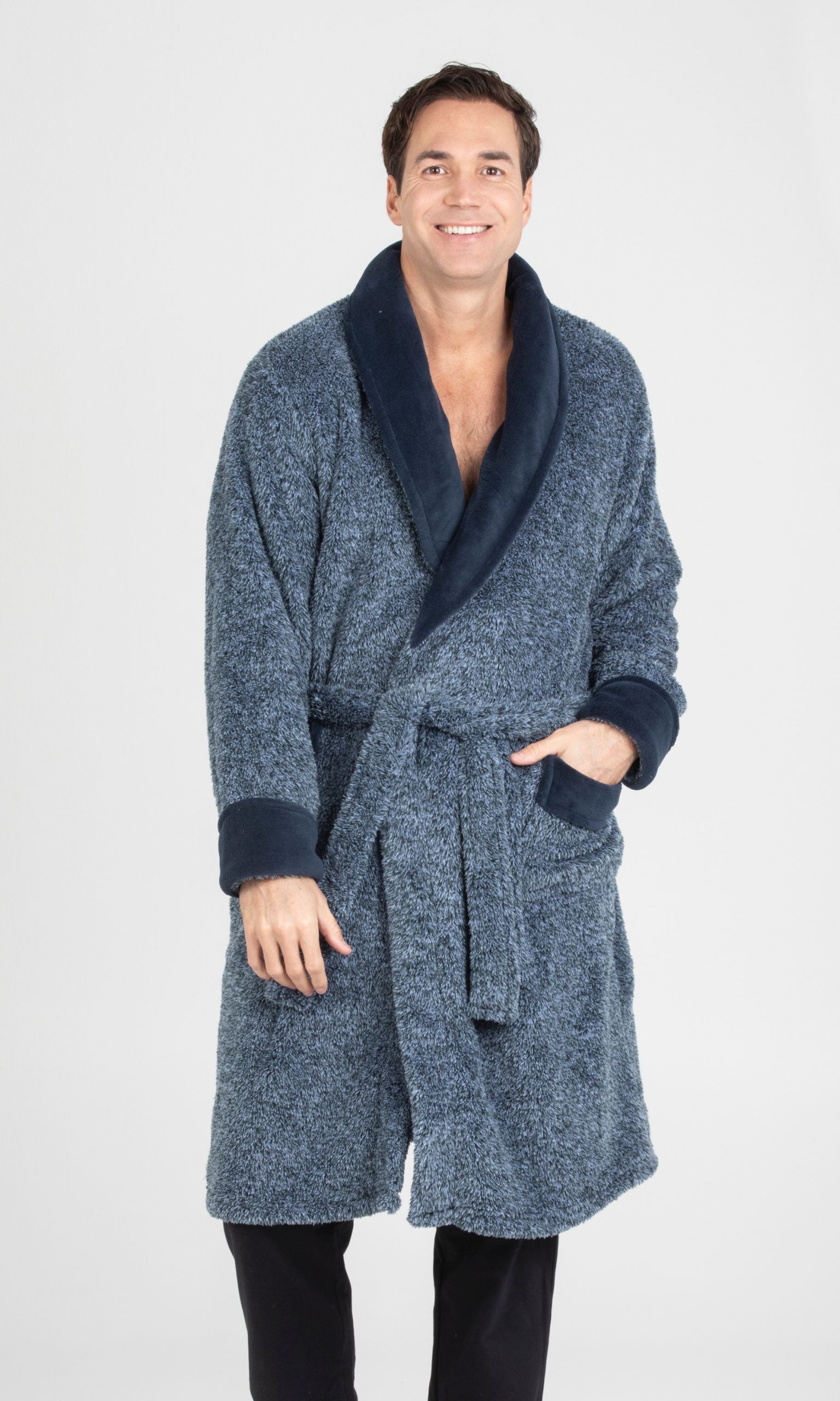 Bata larga de hombre cruzada lisa. Cuello tipo smoking liso, cierre con cinturón y bolsillos frontales. Bata jaspeada de color azul confieren a este clásico un aspecto renovado, moderno y juvenil.